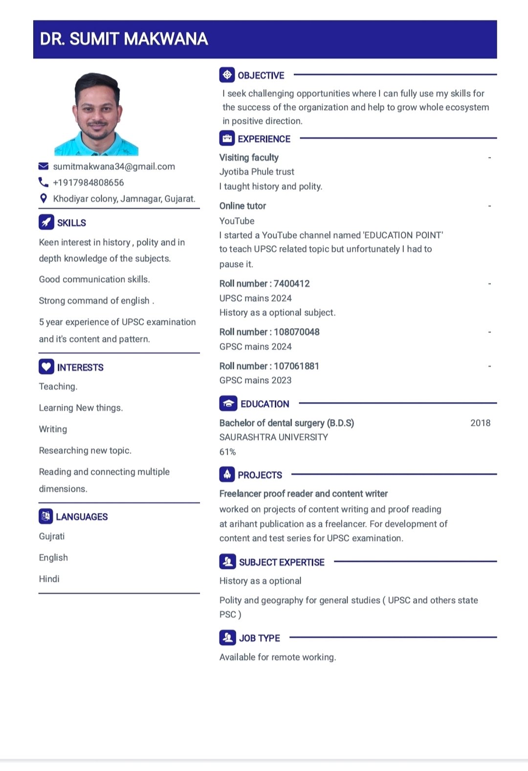 I worked with Arihant publication as a freelancer content writer. I also worked with Writ ED publication for history content writing. I run an YouTube channel for education purpose.